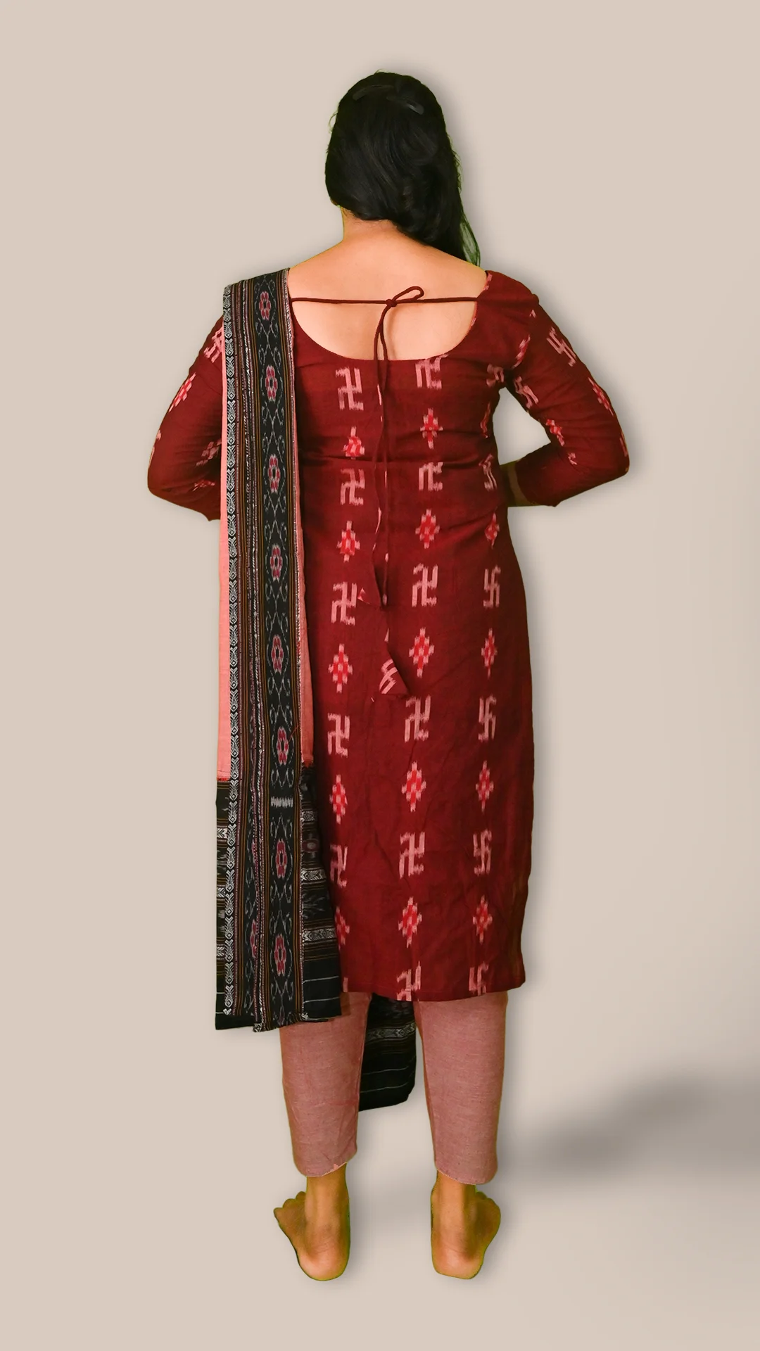 Salwar Suit Set (Ethnic Ikat Style with Swastik Motifs)maroon, beige, and black combination(STITCHED)