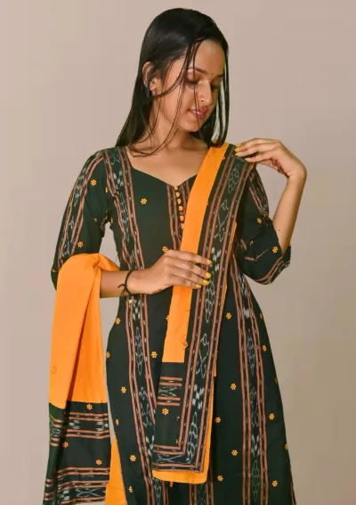STICHED-Sambalpuri Salwar Kameez with Dupatta, Dark green color