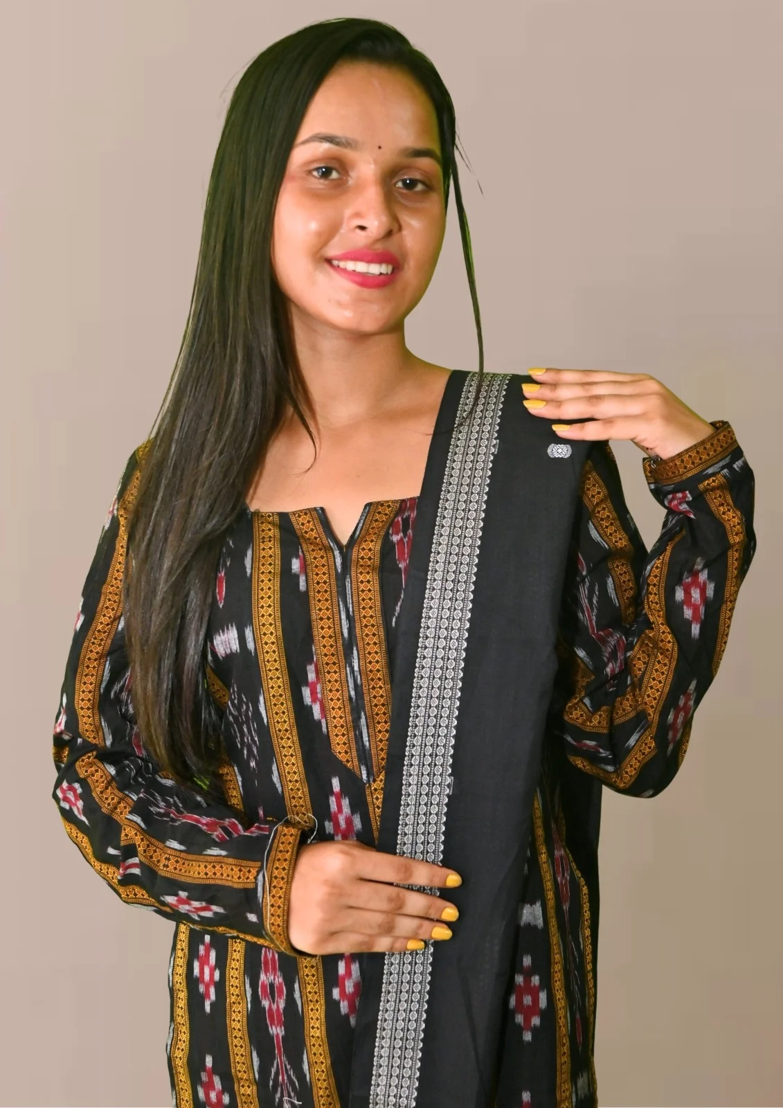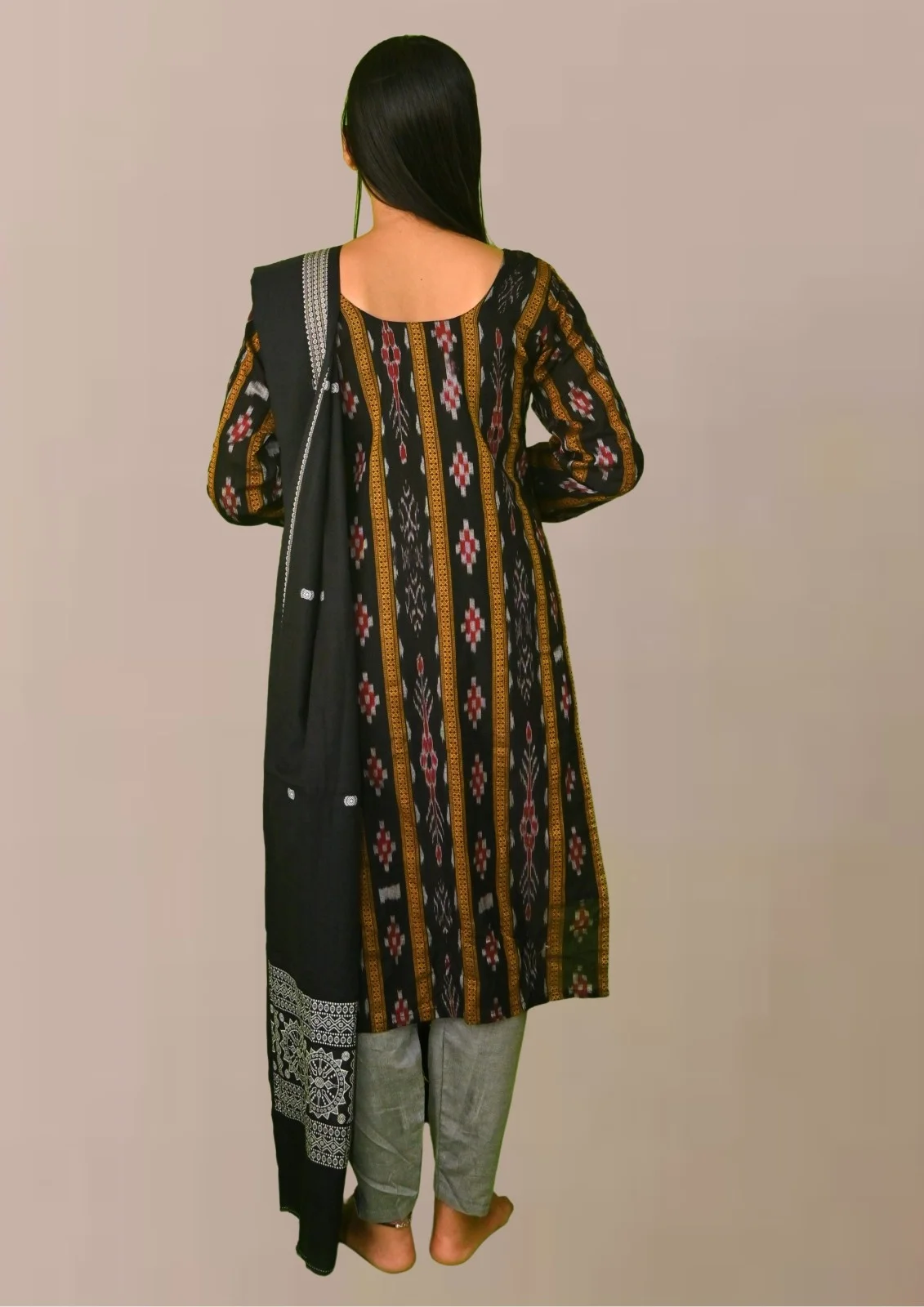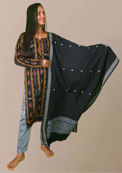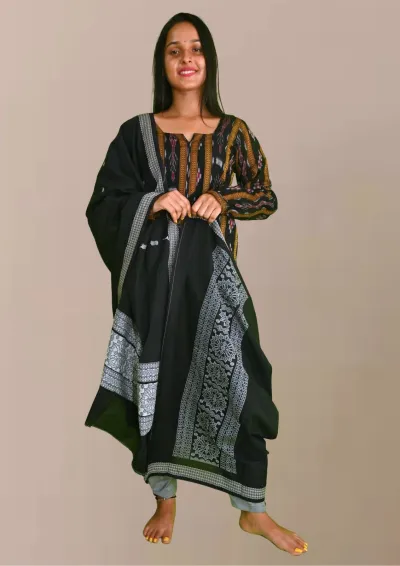 Sambalpuri Suit set Salwar Suit Set (Ethnic Ikat Style)black, mustard, and grey combination(STITCHED)