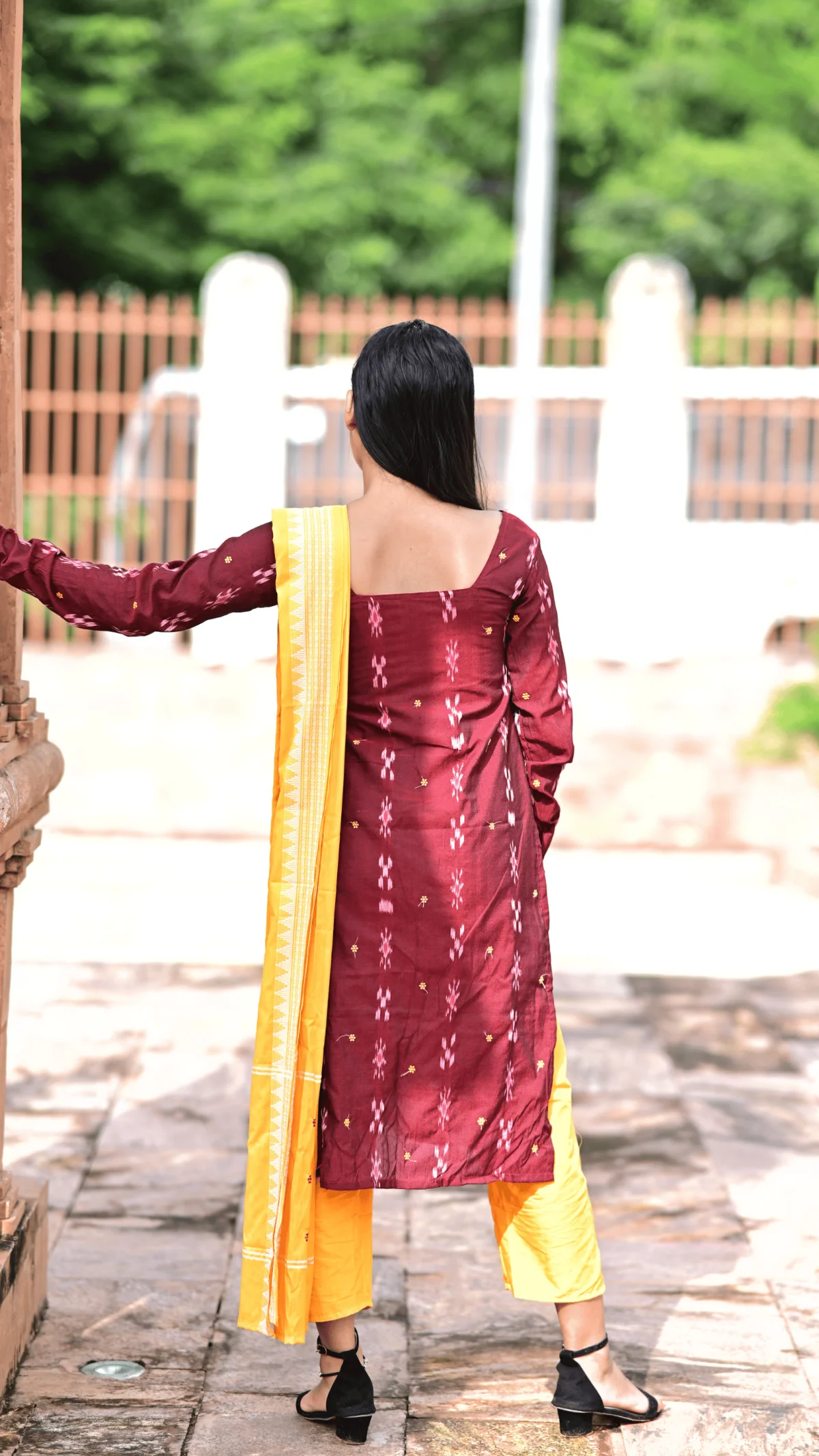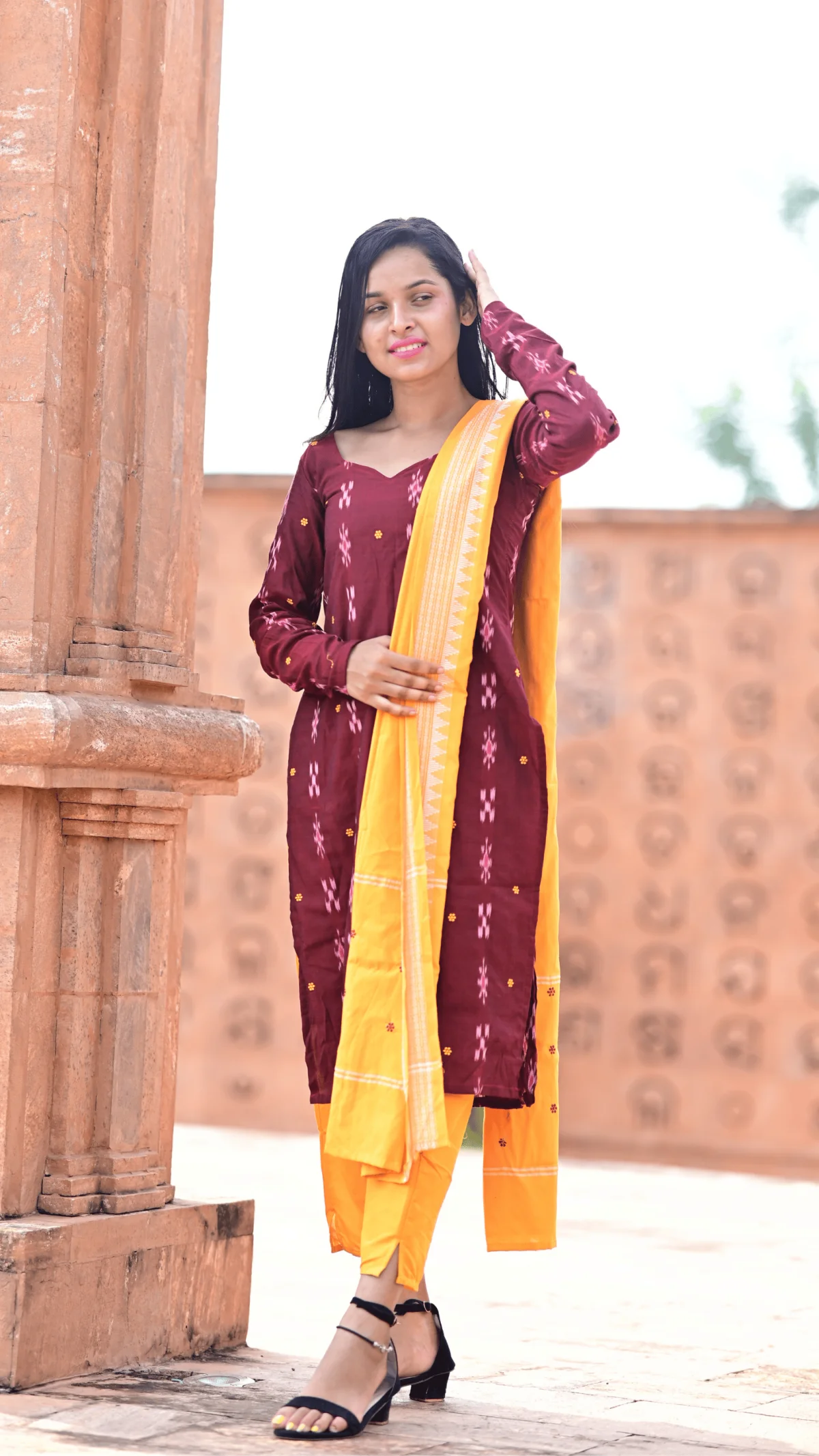 The maroon and yellow combination makes this outfit vibrant yet sophisticated.
