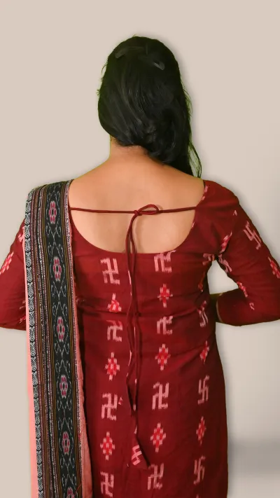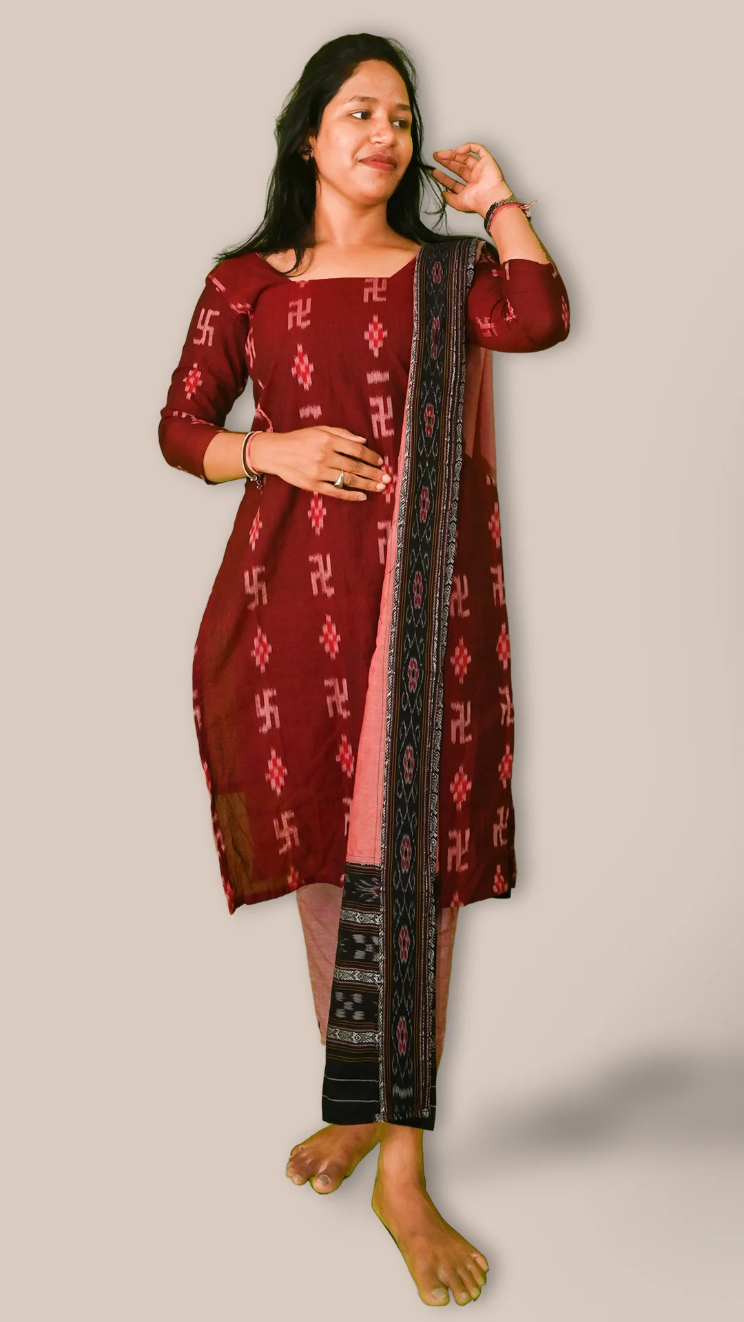 Salwar Suit Set (Ethnic Ikat Style with Swastik Motifs)maroon, beige, and black combination(STITCHED)