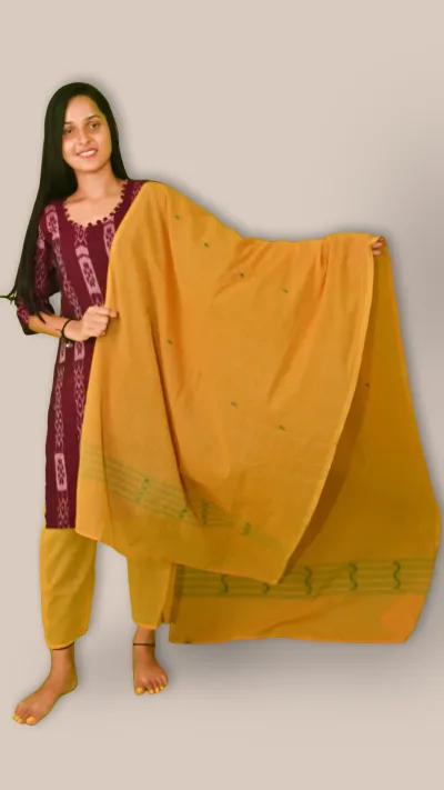 A matching mustard yellow dupatta featuring subtle green border patterns, perfectly balancing the kurta.