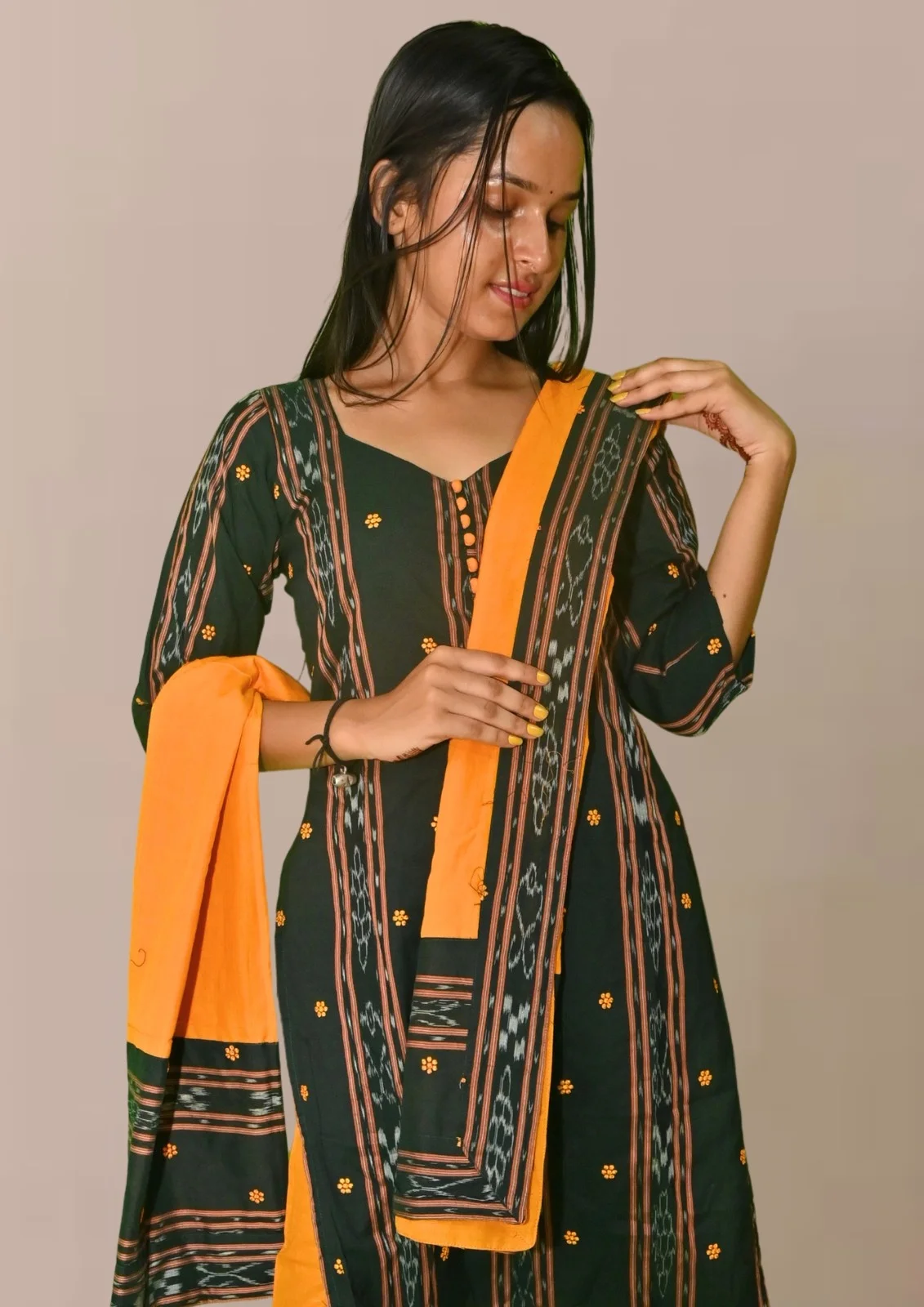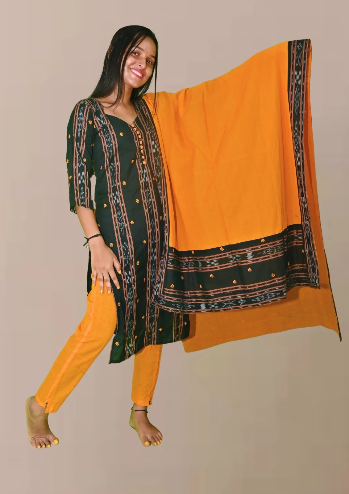 Sambalpuri Suit set Salwar Suit Set (Black & Mustard Ikat Cotton Ensemble)black and mustard combination(STITCHED)