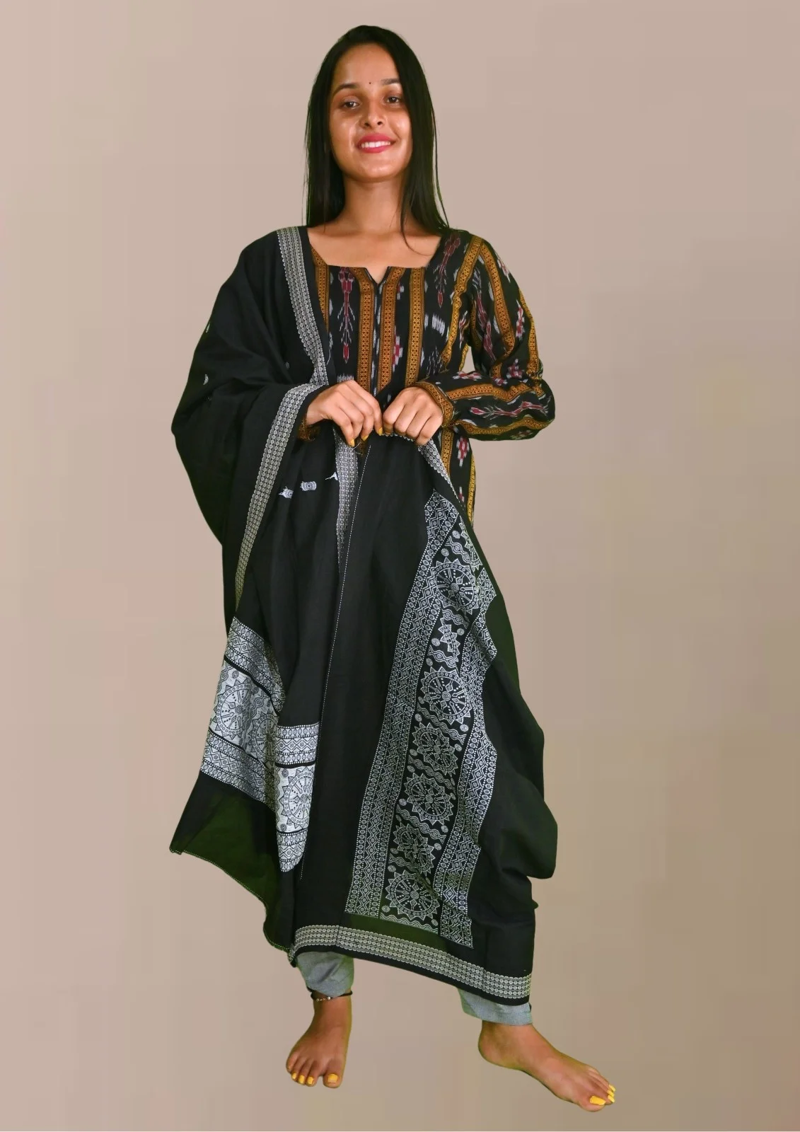 Sambalpuri Suit set Salwar Suit Set (Ethnic Ikat Style)black, mustard, and grey combination(STITCHED)
