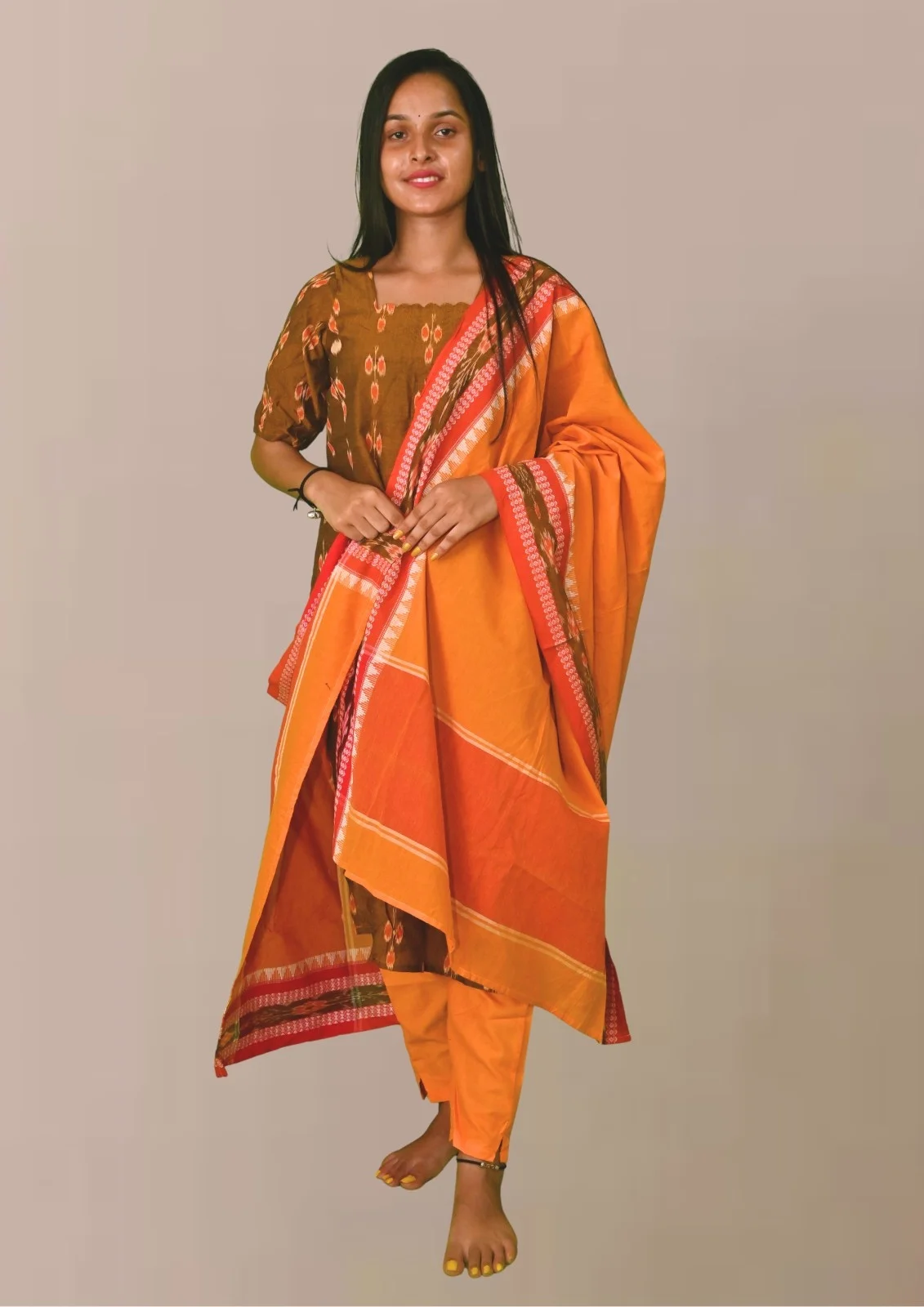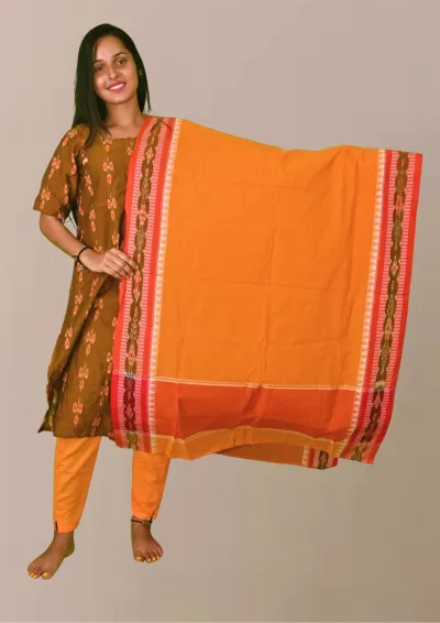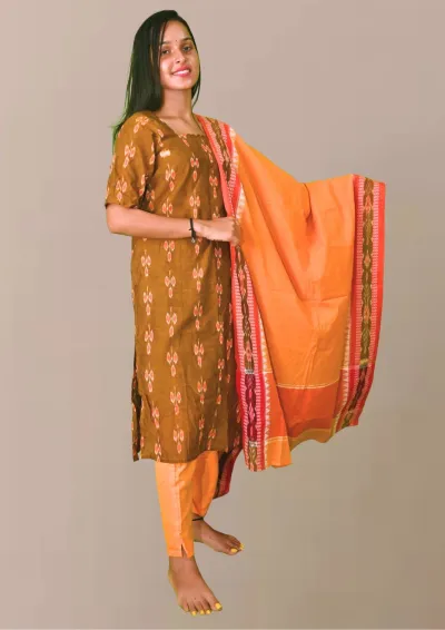 Sambalpuri Suit set Salwar Suit Set (Ethnic Ikat Style)mustard brown, orange, and red combination(STITCHED)